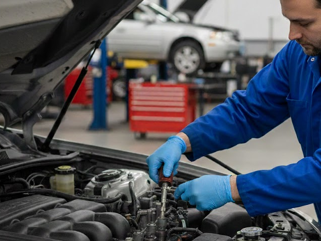 high-detail view of a fuel injection service. The image shows a mechanic’s hands carefully connecting diagnostic and cleaning tools to the engine’s fuel system to remove carbon deposits and restore performance.