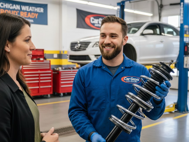 high-detail view of a suspension service. A technician is shown checking the integrity of a strut and surrounding suspension components while the vehicle is raised on a professional shop lift.