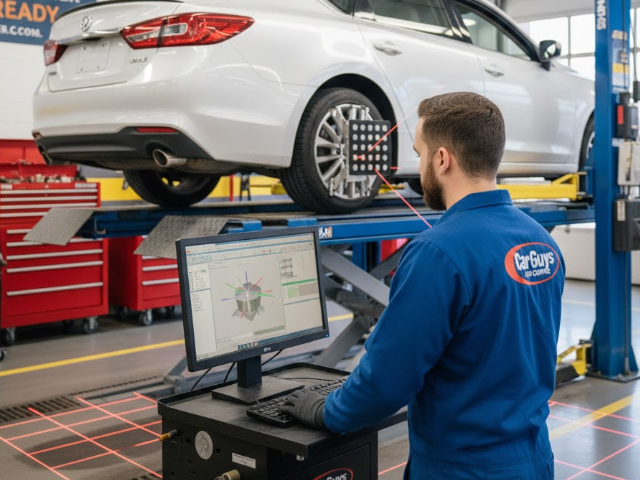 view of a wheel alignment service. The image shows the sophisticated diagnostic equipment used to measure and adjust wheel angles for perfect handling and tire longevity.